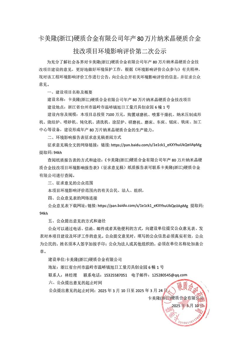 卡美隆(浙江)硬質合金有限公司年產80萬片納米晶硬質合金技改項目環境影響評價第二次公示